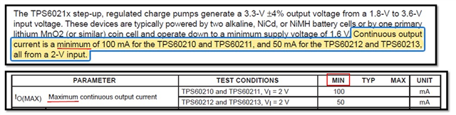 对于TPS6021x,我发现输出电流规格令人困惑,请参阅下面的两个剪辑。 不确定是最小值还是最大值… 如果它是“最小值”,意味着什么?