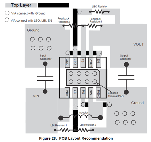 对于布局,建议在数据表中按以下方式进行。 VIN,Vout,GND应按如下所示注入铜。 扩大输出电压引出线以降低寄生参数。 和输出至VOUT的引脚应尽可能短。