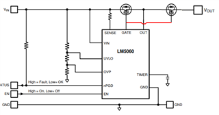 我想知道我是否可以使用 LM5060来控制电池的电压放电。 我设计了一个 BQ34Z100 EVM、并希望使用保护器来防止在负载启动条件下出现过压和电流。 负载将是直流步进电机。