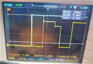这是我第一次在 IN 引脚上施加5V 电压时 BGATE 的波形。 我可以看到2ms 的小脉冲。 我认为这与数据表所说的“器件从 BGATE 中拉出一个小电流2ms 并监控电压”是一致的。但电压太低,只有0.7V。然后 BGATE 保持5V。