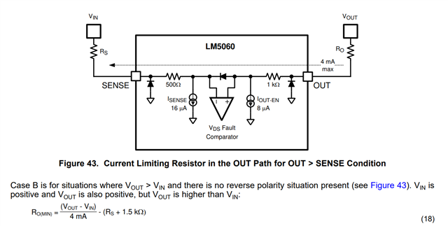 如果发生故障情况、Ro 会导致 OUT 引脚被拉至 GND+二极管压降、而 Vout 仍为50V+。 这会导致 MOSFET 断开、因为 Vgs= Ro+内部二极管上的压降。