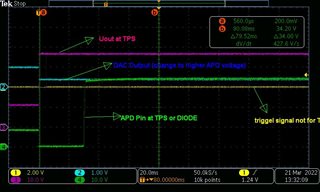 对于我们来说、芯片的内部设置似乎会触发电容器的特定电压电平上的开关。 如果电压值高于转接保持开关将关闭、APD 电压可用。 所有较低的值将导致开关关闭、因此 APD-引脚上的电压将为0V。 至少这将导致我们观察到的不同延迟时间。 我们是否正确?