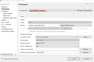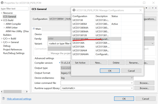 Project properties -> CCS General)-> Manage configurations -> Select UCD3138128A -> Set active -> OK -> configuration select UCD3138218A (active)-> Build again