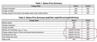 根据数据表表表表2标题、xx105未指定以红色框标出的行为。 但是、我的客户看到这种行为。 在 BQ24105RHLR 上、STAT1引脚也会像这样振荡吗?