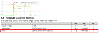 此外、关于以下数据表的内容、有一个200ns 脉冲调节、但是如果该值在正极侧变为 VDD+0.3V 或更高、IC 是否会损坏?