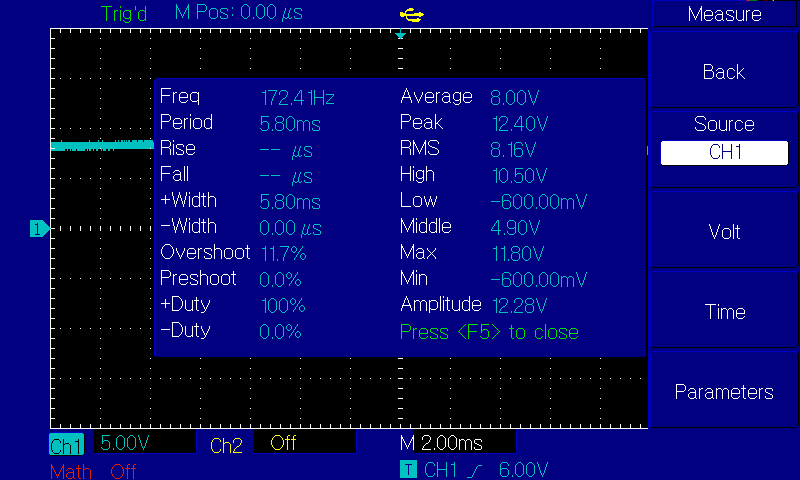 我已经使用万用表检查了带 GND0的 VDD、它显示的是14V、我尝试在示波器上看到波形、但当我将示波器引脚插入  VDD 引脚和 GND0时、电路上的保险丝会一直熔断、 在进行一些谷歌搜索后、我知道我应该将差分探头与示波器一起使用、因为我的电路上有2个 GND、 但遗憾的是、我 没有 差分探头、因为我使用了示波器的2个通道 、并将通道1的信号探头尖端连接到 PCB 上的 VDD 测试点、而将接地尖端探头连接 到通道2和的接地尖端探头 将 PCB 上的 GND0连接到 通道 2的信号探针尖端, 然后将接地尖端探针连接到示波器参考 GND,之后我使用示波器上的减法数学函数从通道2中减去通道1,结果是: