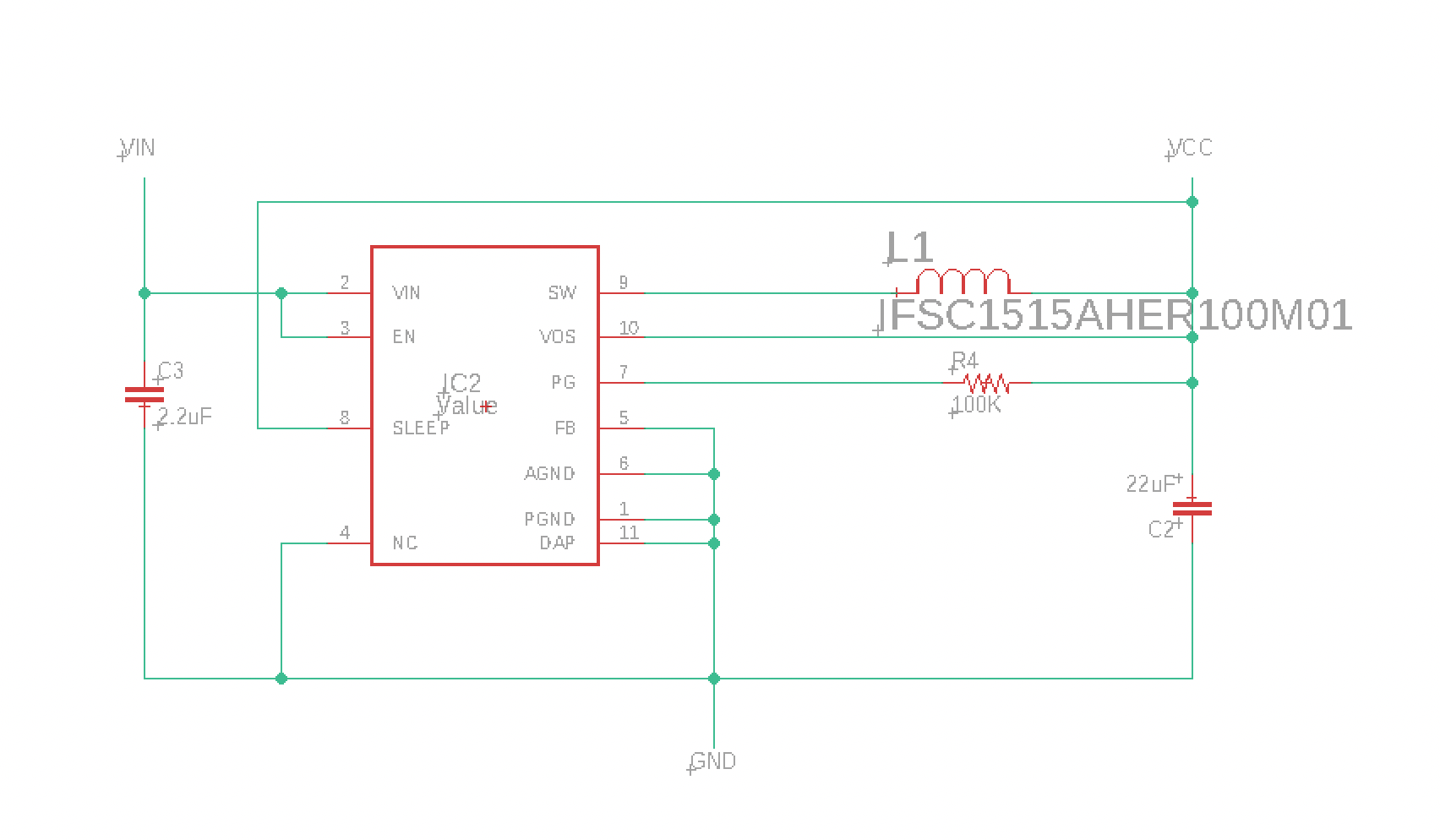 C2为22uF/6.3V、C3为2.2uF/50V、L1为10uH/1.3A、R4为100K (可能不需要、因为我不使用 PG 信号)。