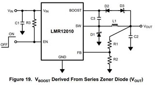 我认为这应该是可以的、因为该单元应该调节一个恒定的6.5V 输出。 且处于该参数范围内:"5.5V > VBOOST-VSW > 2.5V 、D3为2.4V…Ω 6.5V 输出–2.4V 齐纳= 4.1V