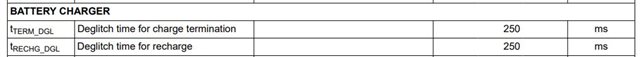 参考 d/s、充电终止和再充电的典型抗尖峰脉冲时间为250ms。  由于没有电池保持 VBAT 电压、因此在重新充电开始前的250ms 典型抗尖峰脉冲时间内、VBAT (BAT 引脚电压)会进一步下降。