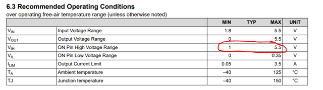 对于 TPS22950、von 是否可以超过 VIN? 它看起来是这样的、基于数据表、但我想确认。 我将其解释为、无论输入电压是多少、1V 至5.5V 之间的任何电压都将启用器件。