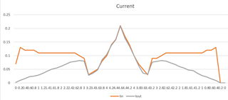 在测试中、我用作源工作台电源、我将电压从0斜升至4.4。 我测量输入和输出电流、测量结果如下所示: