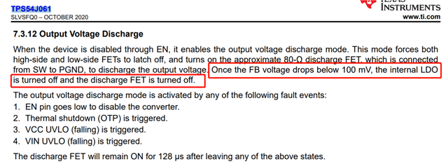 但我看到、在 VFB 低于100mV 后、放电将在内部被禁用。 我想知道、在 EN 为低电平后、是否可以强制将 VFB 拉至 GND 以禁用放电功能?
