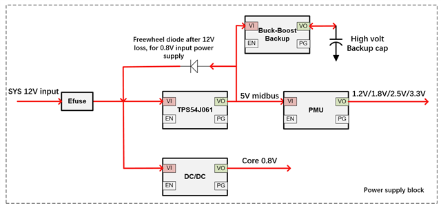 在正常运行中、5V 中总线是许多次级直流/直流转换器的输入、也是备用电容器充电电路的输入。 在功率损耗期间、TPS54J061将被 MCU 自动禁用、备用电容器将在降压模式下工作、并将电容器能量转换为5V、以在 整个器件上持续几秒钟。