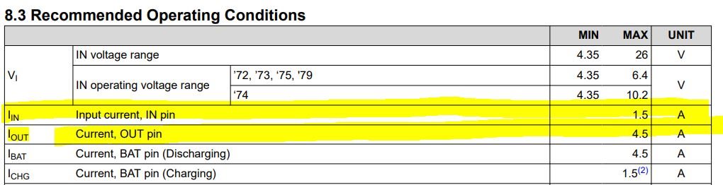 如果我们查看 第10页"建议运行条件"  输入电流的 BQ24073数据表、IN 引脚被称为1.5A、Iout 电流被称为4.5A。