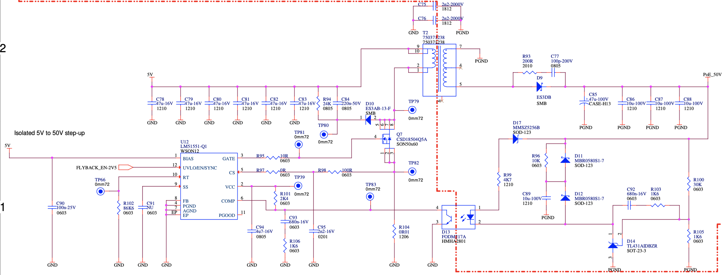 我在 反激式电路中使用 LM51551-Q1进行5V 至50V 转换。 这是电路: