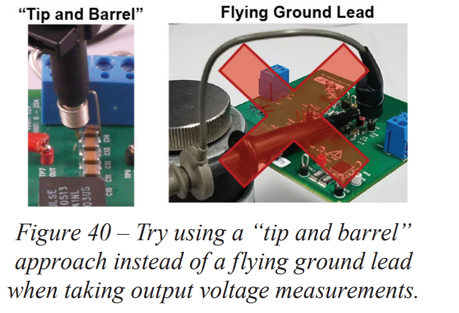 是的、我精确地使用最小的环路、图40中的"尖头和圆筒"图像中描述了这一环路。 尽管如此、我不是从输出电容器上挑选信号、而是从输出连接器本身中挑选信号、因为这是最终到达负载的结果。 今天、我将了解一下探测输出电容器是否有所改进。