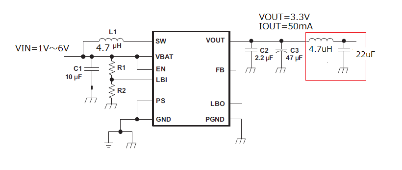 作为电路常量、我打算设置 L1 = 4.7uH、C2 = 2.2uF (陶瓷电容器)和 C3 = 47uF (钽电容器)。
