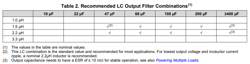 除了确保拐角稳定性之外、LC 组合还受到限制、以使设计过程保持简单。 此外、较低的电感器将具有更好的瞬态响应。 但是、应该可以使用3.3uH 的电容、该电容可以在其他建议的选项范围内产生 LC 双极。 这与 TPS62130系列应用手册(见上文)中使用的方法类似、其中使用其他电容组合测试了较大的 L 值。
