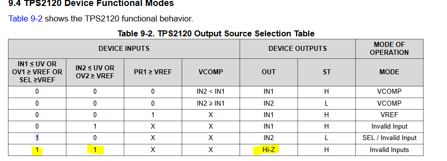 由于您询问具有 SEL 引脚的器件、因此假设您是 TPS2120。 适用的真值表 实际上就在表9-2中的表9-3的上方。