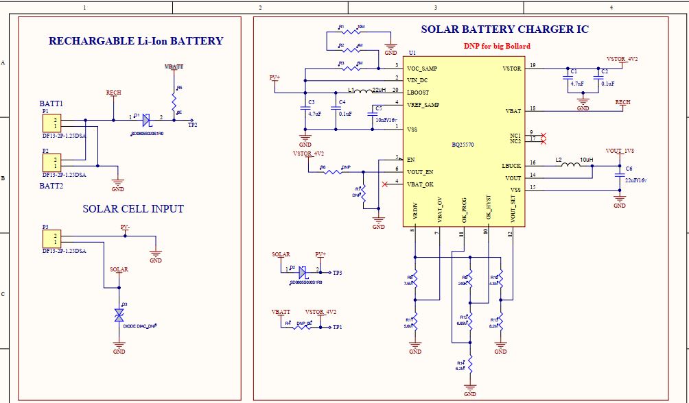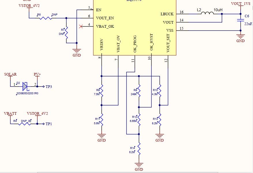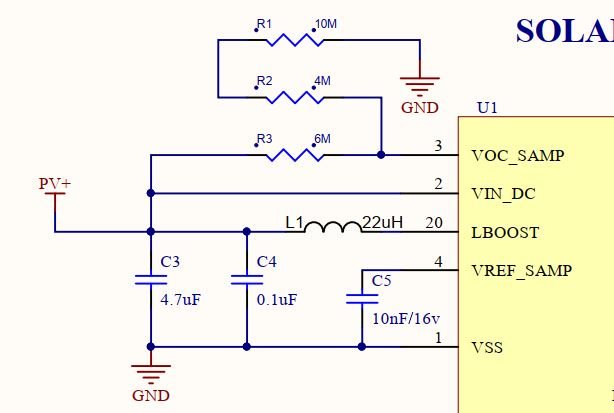 首先、您的面板是提供5V 还是其 MPP 小于5V?  我无法看到 VOC_SAMP 电阻器的值。  无论采用何种 VMPP、VBAT_OV 设置都必须高于该值、因为这只是一个升压充电器。  如果 VMPP 高于 VBAT_OV、则充电器将在 VIN_DC 上打开一个下拉电阻器、以防止电池板对存储元件进行过压。
