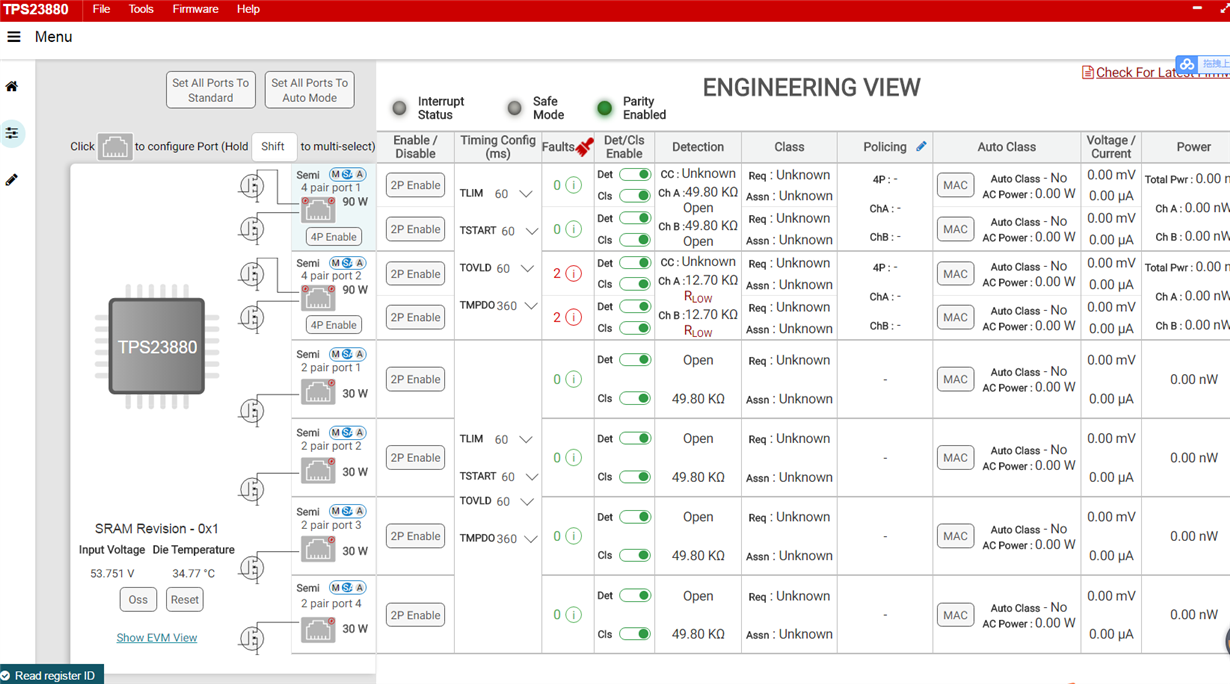 我已经在我的末端验证了 TPS23880能够打开检测电阻较低的非标准 PD。 从屏幕截图中可以看出、PSE 端口仍处于半自动模式、这意味着如果没有有效检测、则无法开启该端口。 因此、在半自动模式下验证12.5K 后、必须先切换到手动模式、然后按顺序使用2P 开启。 此外、请在开启期间检查 PD 侧的电流。 在前60ms 浪涌阶段、PSE 会将浪涌电流限制为425mA。 请确保 PD 的电流低于该值。 下面是打开端口的步骤: