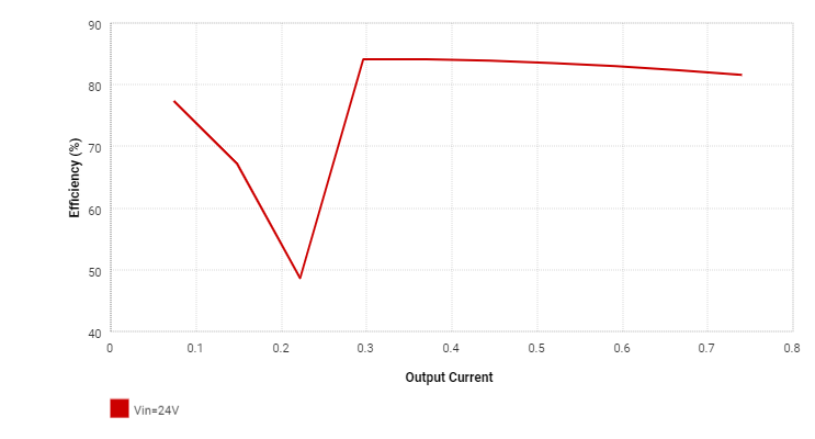 请注意、在图52 (Vout=12V 效率)中、24V 输入的实心蓝色线迹对于所有负载电流的效率均高于80%。 我必须与 Webench 仿真团队核实、以了解该仿真为什么在该过渡点效率会急剧下降。