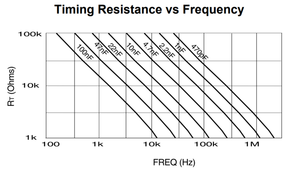 此外、数据表还建议计时电阻器值介于5k 和100k 之间。 如果您注意到下面的图10、则该电阻器值与频率之间存在线性关系、但在该范围之外、该图是非线性的、更难预测(请参阅下表)。