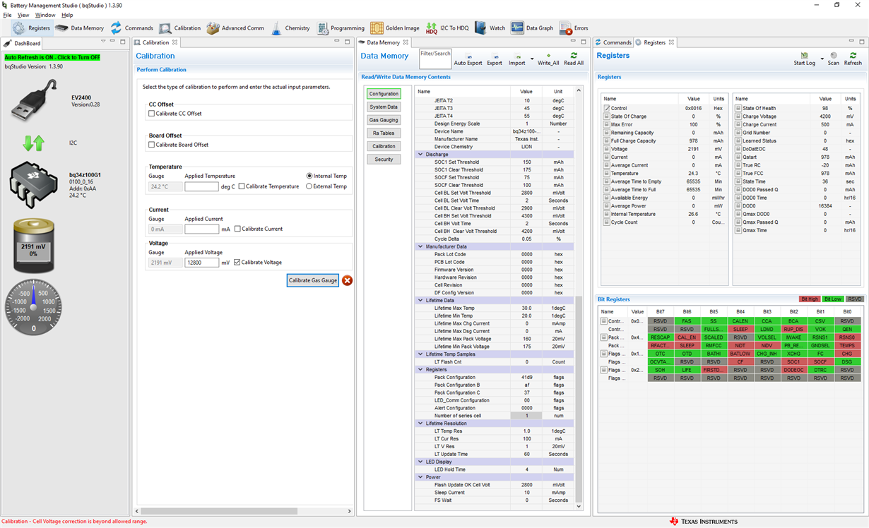 我正在尝试将12V 2.3Ah 铅酸电池与 BQ34z100EVM 和 EV2400配合使用。