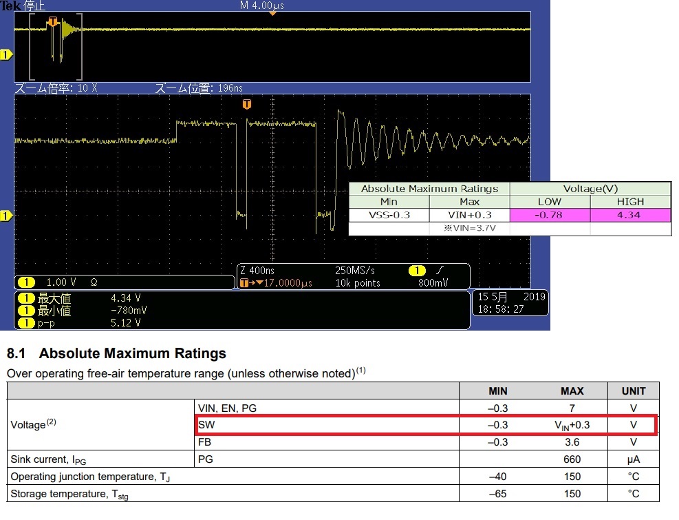 最大值(4.34V)和最小值(-0.78V)的测量值超出了 最大绝对额定值(VIN+0.3=3.7+0.3=4.0V)和最小值(-0.3V)的规格。