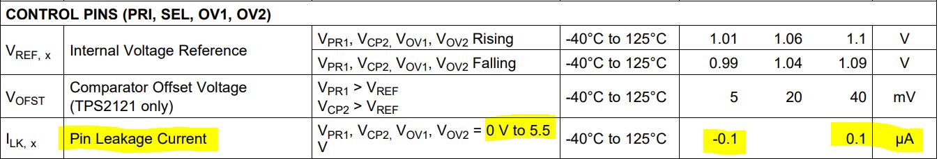 PR 和 OV 输入具有高阻抗、无需太多驱动强度即可设置节点、如下面的泄漏规格所示。 您可以将电阻分压器增加10倍、并将电流消耗降低到~100s uA、这足以驱动此节点。