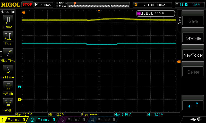我在 TLV76033DBZR 上遇到问题。 当我们在输入(14V 电源轨)上有瞬态时。 我可以看到该 LDO 未立即调节瞬态。 我们可以看到电压降约为100mV、并一直保持到瞬态结束。 我还在瞬态期间观察到了 SAW 波形。 我认为这是由 Cout 引起的、C28可能太大、无法延迟调节。 我删除了 C28。 图片显示了结果。 3V3电源轨平稳。 但100mV 压降会保持不变。  为什么 LDO 在瞬态期间不将电压调节到3V3?