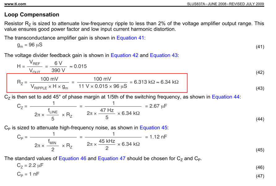 对于 Rz 的大小没有硬性限制、但最终会遇到功率因数和稳定性问题、减小电阻的幅度越小。 补偿电路使用 II 型补偿、其中1/(2pi*Rz*CZ)为零、而极点为(cp+CZ)/(2pi*cp*Cz*Rz)。 当您降低 Rz 时、您将零点和极点移动到更高的频率。 因此、您的交叉频率可能会增加、COMP 的线路频率纹波将增加2倍。 2x 工频纹波将导致更多的电流失真。