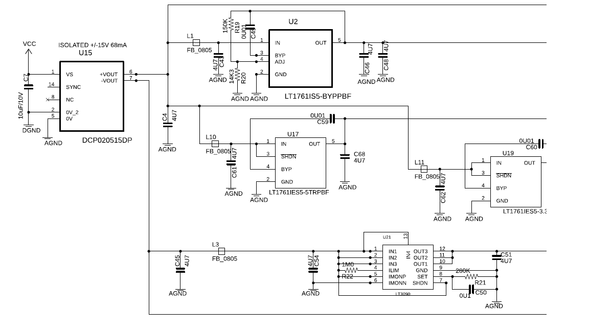 我们有一个采用 DCP020515D 的设计。 输出-15V 馈电至 LT3090 (U21)、 我在 LT3090输出端得到大约30mV Vpp 的纹波电压。