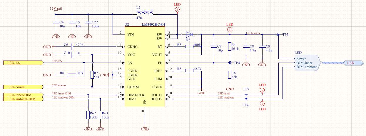 红色 LED 标签仅是 Altium 的网类标识符。 LED 连接在两个灯串的 Netlabels LED 电源和 LED 内部/LED 环境之间。