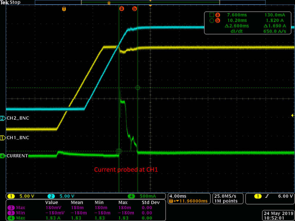我提出这些问题的原因是、当输出电压已经达到稳定状态并且电平高于1.87*I(ol)+0.015A 阈值但快速跳变比较器未被触发时、我们会在电路板中观察到第二个浪涌电流事件。 我们做了一个实验来确定将触发快速跳变比较器的电流峰值电平、并且发现它是2.27*I(ol)。 我们希望了解更多有关电子保险丝对稳态期间出现的浪涌电流的反应以及将关闭电子保险丝的电平的信息、以便我们能够继续优化设计。 请提供建议。 谢谢。