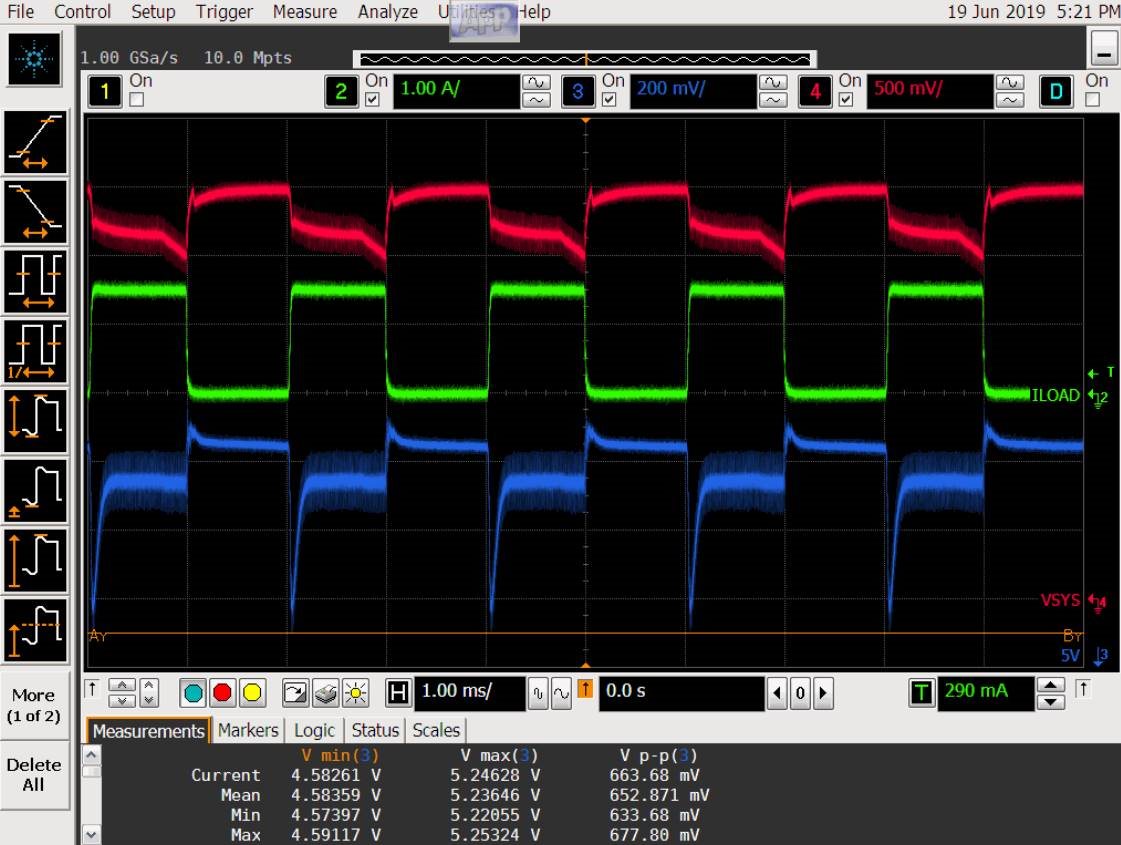 我的客户在导通/关断持续时间为1ms 的测试中应用0A -> 1.5A 阶跃负载、我们预计输出电压应在5V±10%范围内。