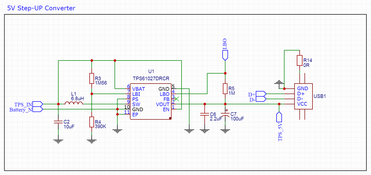 器件型号:TPS61027 我们使用 TPS61027将 USB 的电池电压升压至3V 至5V。 我们还使用 LBO 引脚来检测2.5V 下的低电池电压。