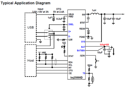 在应用图中、器件 USB 使用开关将 USB 更改为 BQ25898D 或主机、如下所示: