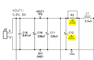 查看 用户指南中给出的 TPS51220AEVM-476原理图、 有几个电阻器和电容器不是尺寸的、实际上用三角形的符号标记。 三角形符号意味着什么? 注释是否与对的大小相关?