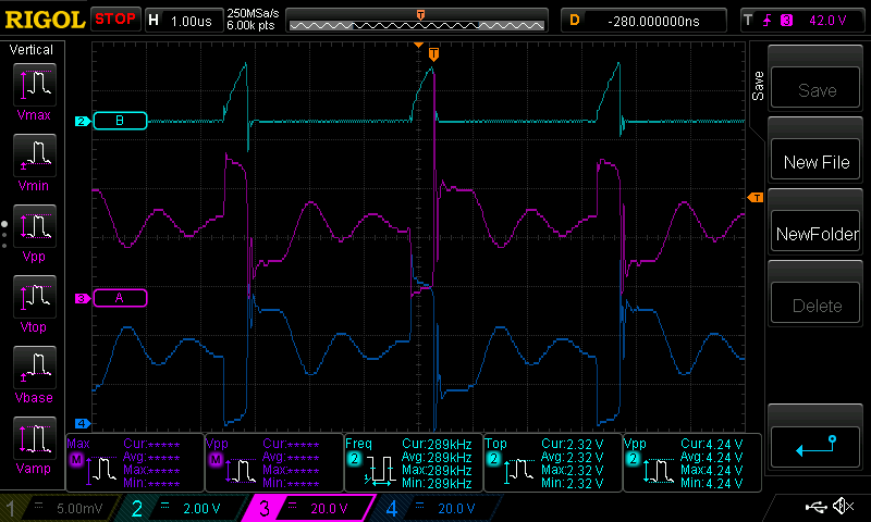这些尖峰为2V,CS 引脚在每个周期都被激活,并触发 IC 的过流保护,因此输出被“扼流”。