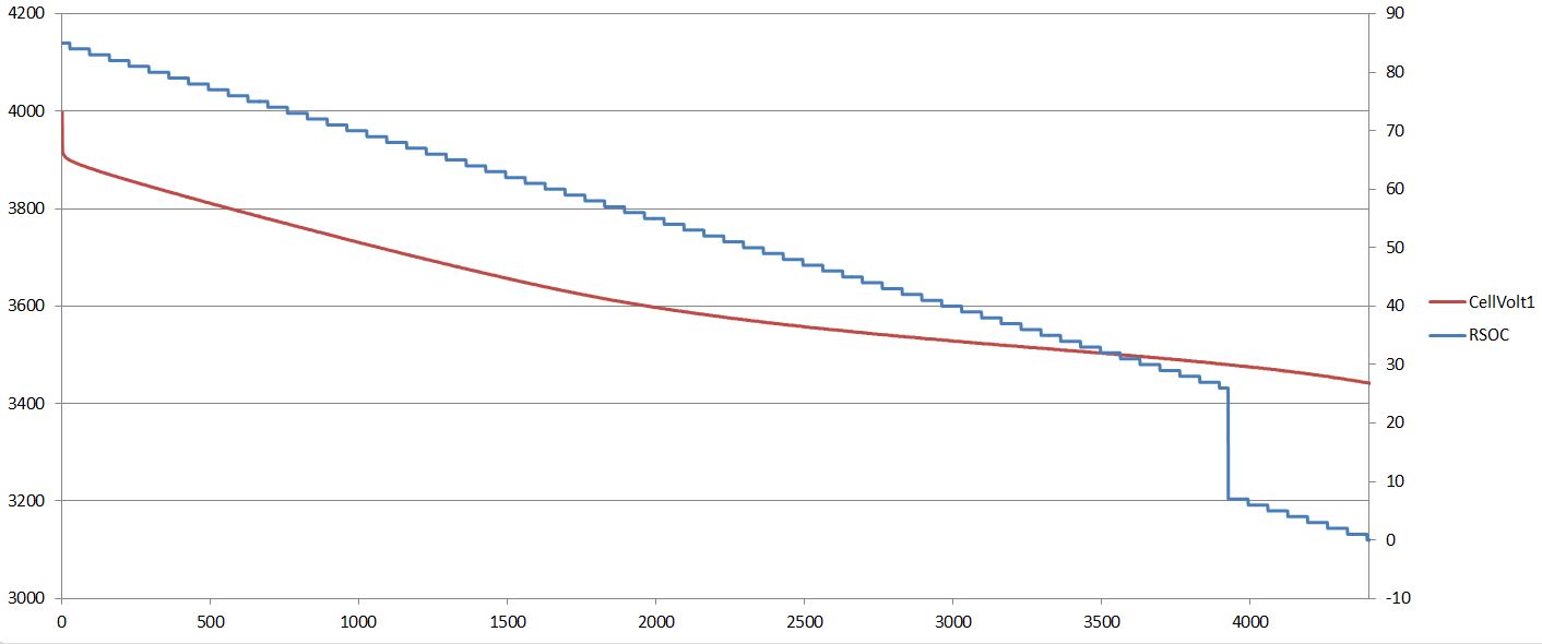 RSOC 达到26%后、该值突然下降至7%。 在3.4V 的高得多的电压下、它达到0%、而我实际上想将它放电至3.0V。