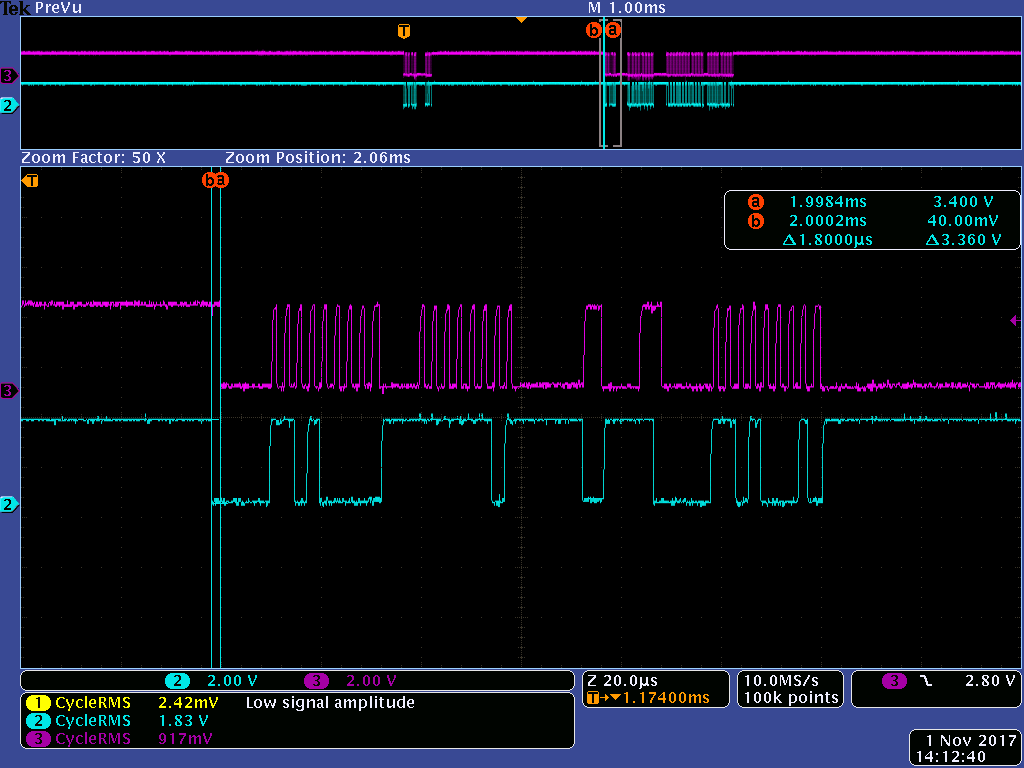 黄色:ALERT 引脚、紫色:CLK、蓝色:数据