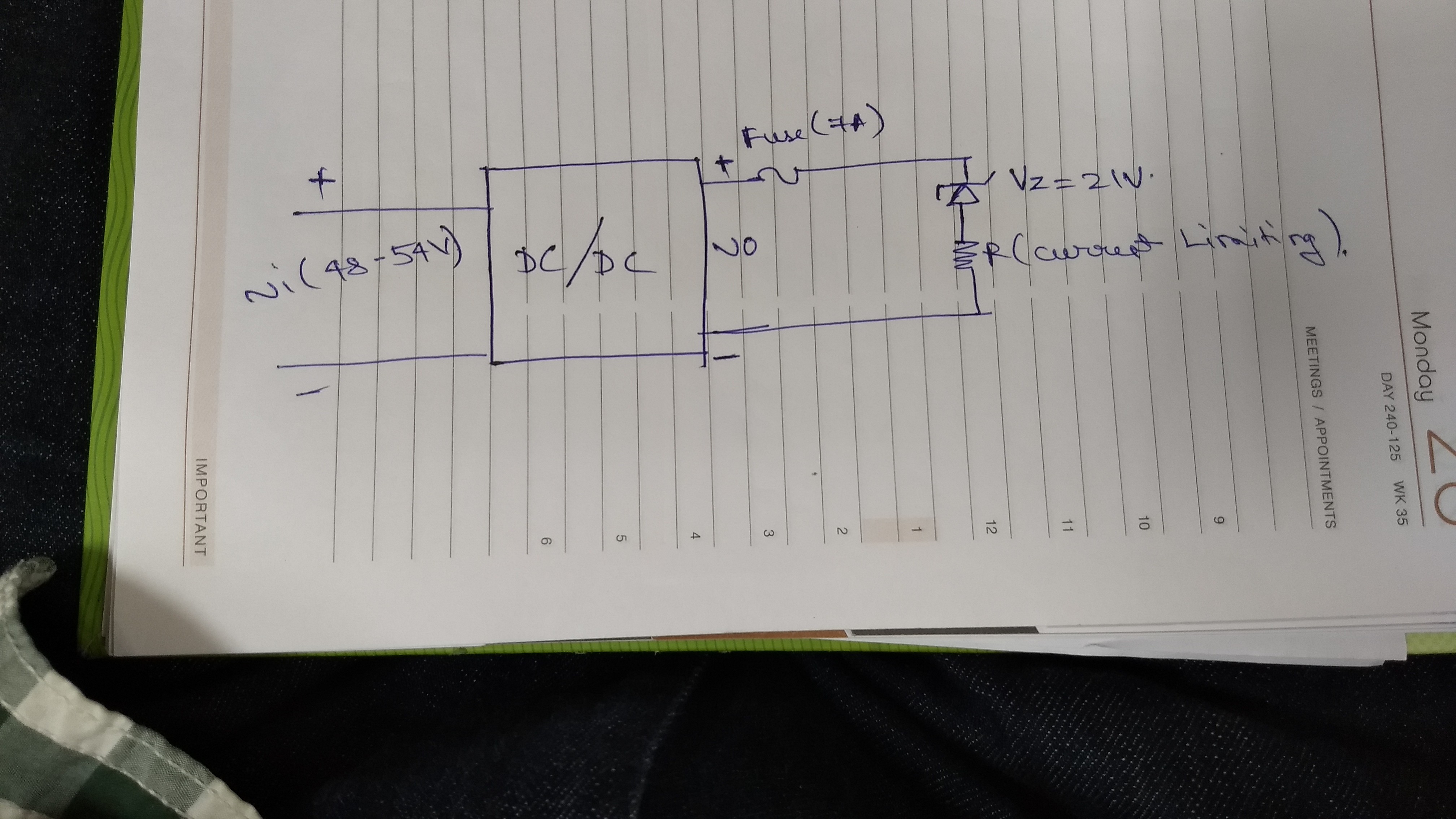 他们一直在尝试实现过压保护电路。 开关的漏极和源极(MOSET)可能 会短路、并且负载上可能会出现完整的输入电压(我们的情况是48V 至54V)、并可能损坏它。  它们已将一个与输出串联的7A 保险丝和 21伏齐纳二极管与负载并联的限流电阻。 此电路已连接以供您参考。
