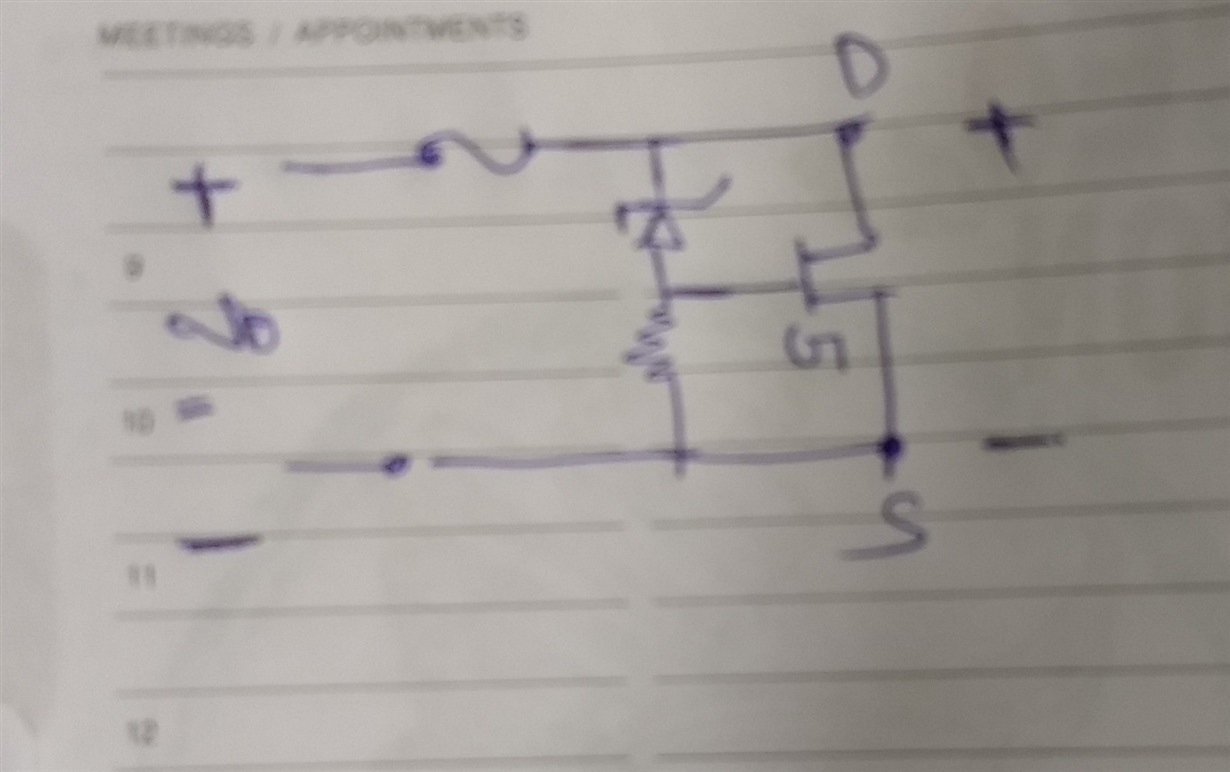 我们假设、如果负载上的电压达到48伏、齐纳二极管会将电压钳制在21伏(VZ= 21V)、剩余电压(48-21=27V)将出现在保险丝上。 但是、保险丝上没有压降、整个电压出现在负载上。 请查看并 建议是否需要任何修改。