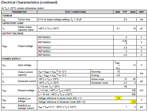遗憾的是,我们没有这样指定使能阈值引脚。 REF34-Q1数据表在表7.5底部提供了使能引脚电压规格(VEN)。 它提供了整个温度范围内 EN = 0所需的最大值和 EN = 1的最小值。 如果客户提供的电压在这些最大/最小电压范围内、则他们可以保证 EN = 0或 EN = 1。