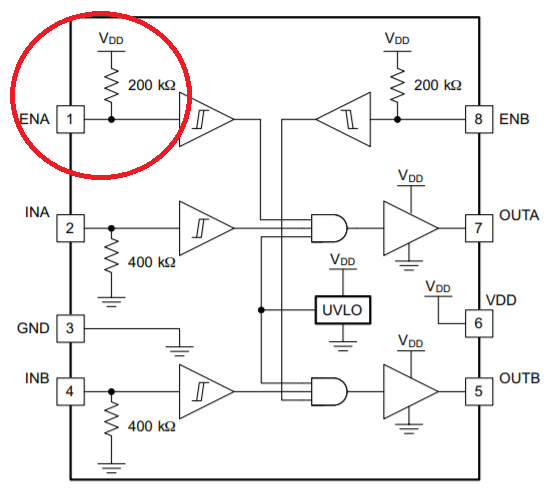 我们测试 UCC27524的 Vdd 大约为6V、然后 电路板中的 ENx 大约为1.7V、因此启用了我们不需要的 DIeriver。