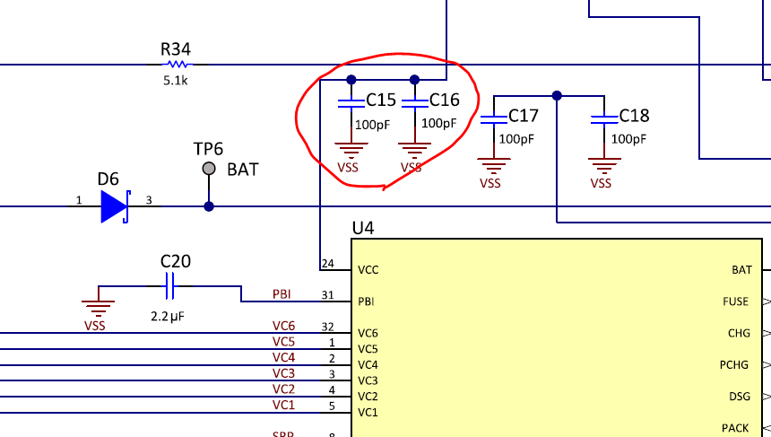 您是否移除了 PACK 引脚上的电容? 电容 C6? 这将缩短 DSG FET 关断时间。 Vcc 上的另外两个电容是必需的。