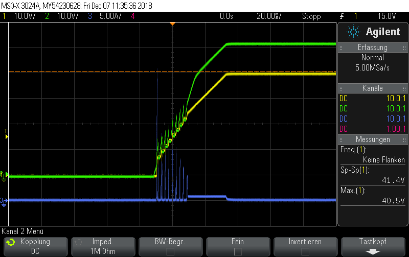 每次我连接一个负载时(在本例中、我首先使用1000uF 电容器对其进行测试)。 控制器停止工作。 它尝试加载电容器、但在启动时间延迟后停止(在我的情况下大约为400ms)。 我记录了输出电压和栅极至 GND 电压的电压。 请参见下面的。 输出电压 未升高