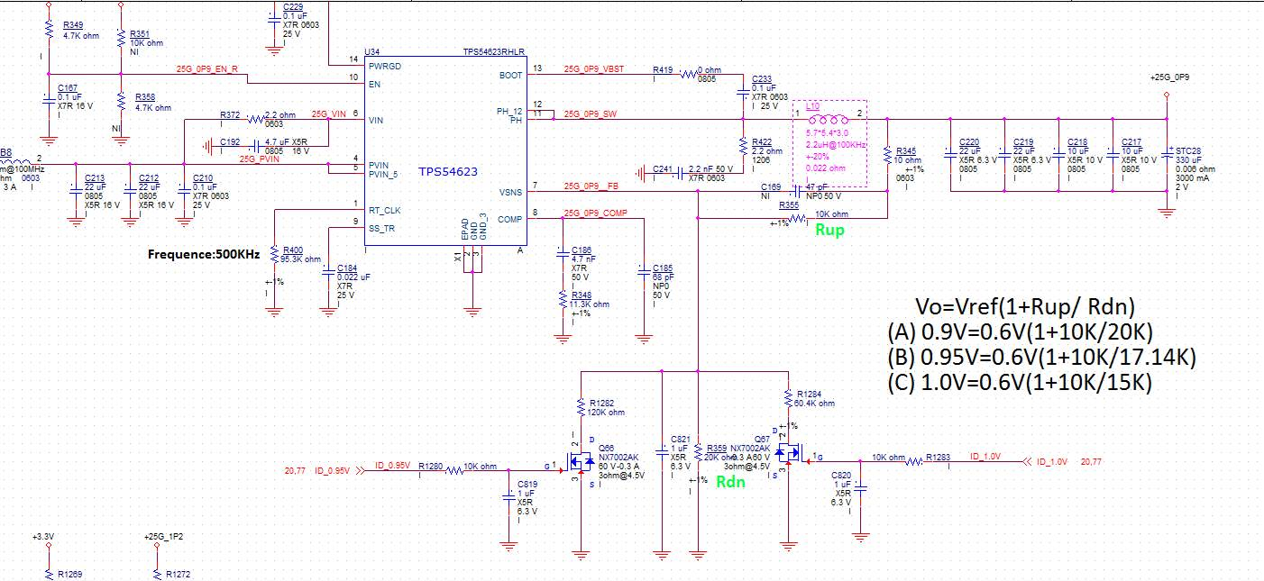 OVP 功能是内置的、无法禁用。 在您的情况下、如果您将电压设置为1V、分压器为10k 和15k、则通过将底部电阻器设置为20k、切换到0.9V 工作电压、 然后 FB 电压将暂时变为0.666V。 这足以触发 OVP。 这取决于您在电压之间切换的速度。 OVP 不具有锁存保护。 它会减慢电压转换的变化率。 您可能会在开关节点中看到跳过的脉冲。 我还看到您有一个与 R359并联的1uF 电容器。 这可能会引入一些稳定性问题、因为它非常大。