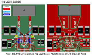 遗憾的是、该器件对布局非常敏感、尤其是 PMID 和 SYS 电容器。 除非100nF PMID 和 SYS 电容器尽可能靠近 PMID 和 SYS 引脚以及 GND 之间没有通孔、否则输入电流和电池充电电流感应电路无法正确读取。 这意味着、到电感器的 SWX 线必须在 IC 下方布线、然后通过通孔连接到电路板的底部、并在 C1和 C2为100nF 的情况下进一步远离 IC 进行备份。 这会使电感器的大电感和 DCR 增加可忽略的电阻和电感。 数据表建议的布局如下所示。